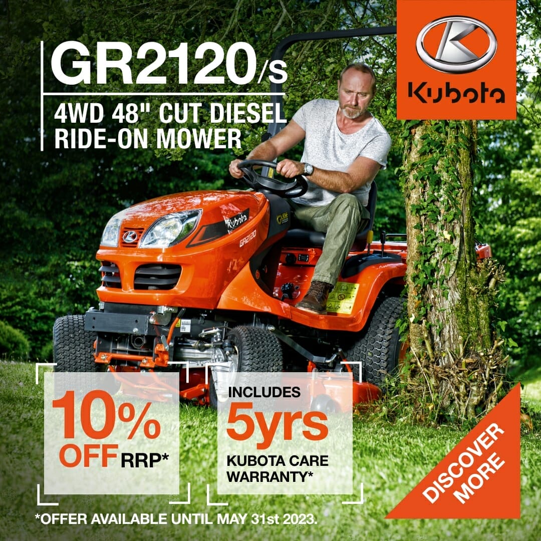 There’s 10% off the Kubota GR Series of Mowers in May, with 5 years Kubota care warranty!